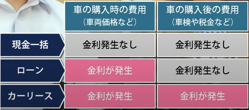 したがって、ローンもカーリースと比較すると、総支払額は安くなります。 カーリースは維持費にも金利が適用されるため、結果的に現金やローンよりも割高になる傾向があるのです。
