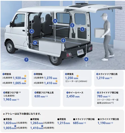 「e‐ハイゼット カーゴ」の4シーターは軽キャブオーバーバンNo.1の積載スペース、「e-アトレー」は軽キャブオーバーバンNo.1の荷室スペースとなっています。