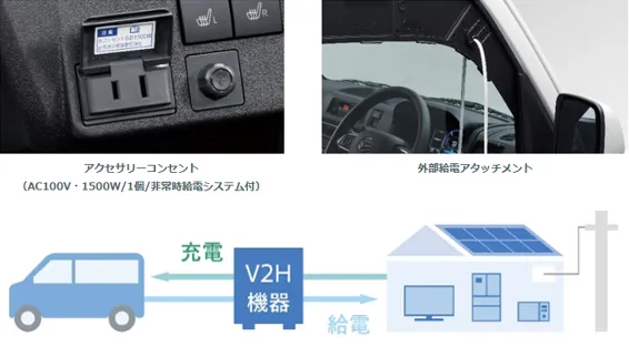 走行時でも使えるAC100Vで最大消費電力の合計が1500W以下の電気製品が使用可能なアクセサリーコンセントを装備、災害時などで電力が必要な車両の走行機能を停止した状態で給電ができる非常時給電システムも搭載、付属の外部給電アタッチメントを使用すればフロントドアとドアガラスを閉めた状態でも車外に電源コードを引き出して給電が可能です。