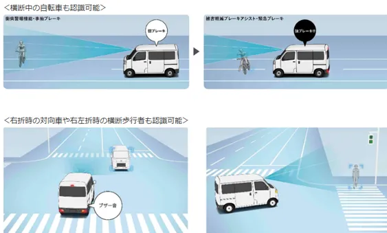 ステレオカメラの性能向上でより広範囲な検知・認識が可能となり、衝突警報機能(対車両/対歩行者[昼夜])および衝突回避支援ブレーキ機能(対車両/対歩行者[昼夜])が進化により、横断中の自転車や、交差点での右折時に対向方向から直進してくる車両や右左折時に対向方向から横断してくる歩行者も認識可能になりました。