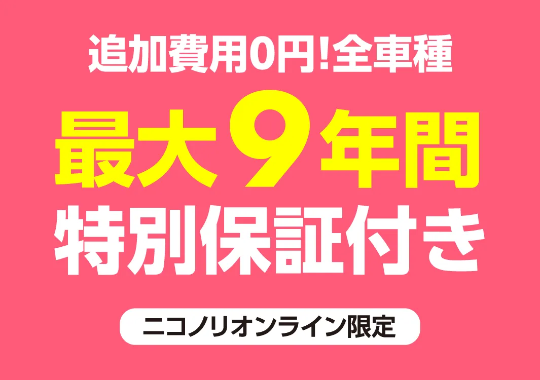 即納車両を確認 ›オンライン販売でご契約された新車には、全車両・全期間の特別保証が付いています。通常5年間の特別保証期間を、最大9年間まで追加費用0円で延長いたします。