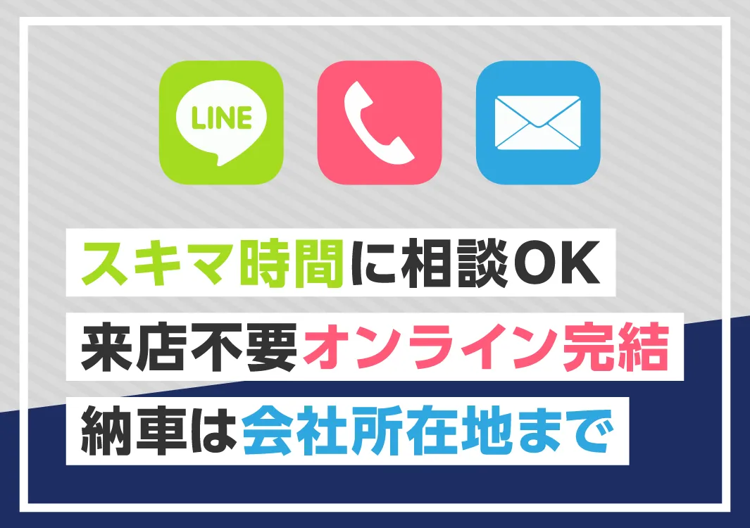 電話、LINE、メールを使用してプラン選びから納車まで完全にサポートします。追加オプションについてもお気軽にご相談ください。※店舗での商談も可能です。