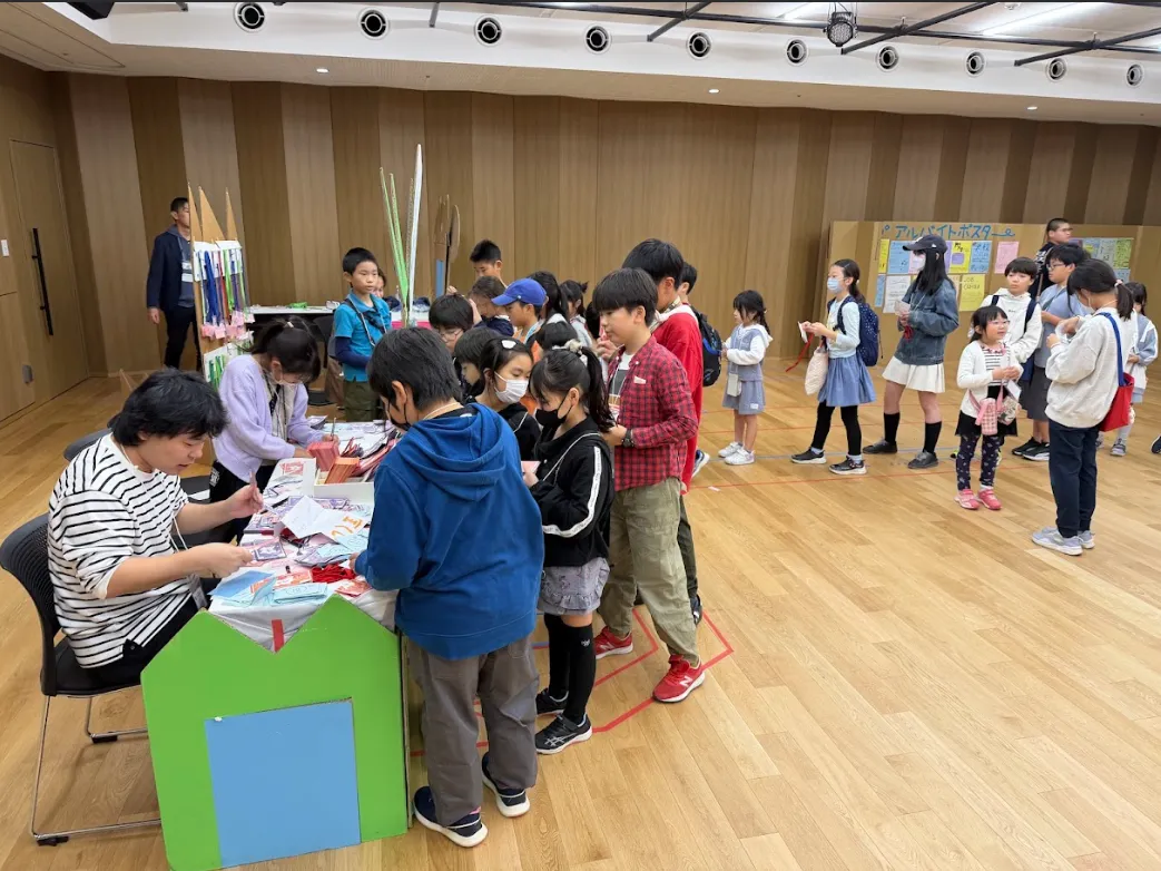 駄菓子屋さんやゲームセンター、食品サンプル屋さん、税務署、市長選挙投票所など、たくさんのお店があり、すべて子どもたちだけで運営していました。 アルバイトで初めて顔を合わせた子も、素敵なお店になるように、共に働く仲間としてすぐに協力し合う姿は一体感に満ちていました!